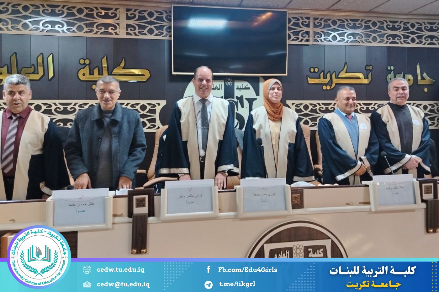 شارك الأستاذ الدكتور فوزي حميد جمعة، التدريسي في قسم الكيمياء بكلية التربية للبنات – جامعة تكريت، في رئاسة لجنة مناقشة أطروحة الدكتوراه المقدّمة من الطالب بشير أحمد جوير، من قسم علوم الكيمياء – جامعة تكريت، وذلك بصفته رئيسًا للجنة المناقشة الخارجية.
