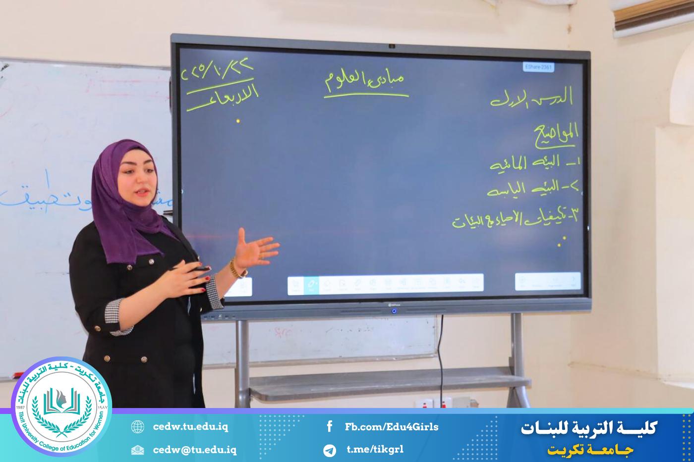 تم تنفيذ المحاضرة باستخدام الشاشة الذكية، حيث عرضت الطالبات نماذج تعليمية تفاعلية تناولت موضوعات من مجال التربية الأسرية والتغذية والتصميم الداخلي، مع توظيف أساليب عرض حديثة تعزز من التواصل بين المعلم والمتعلم داخل الصف.