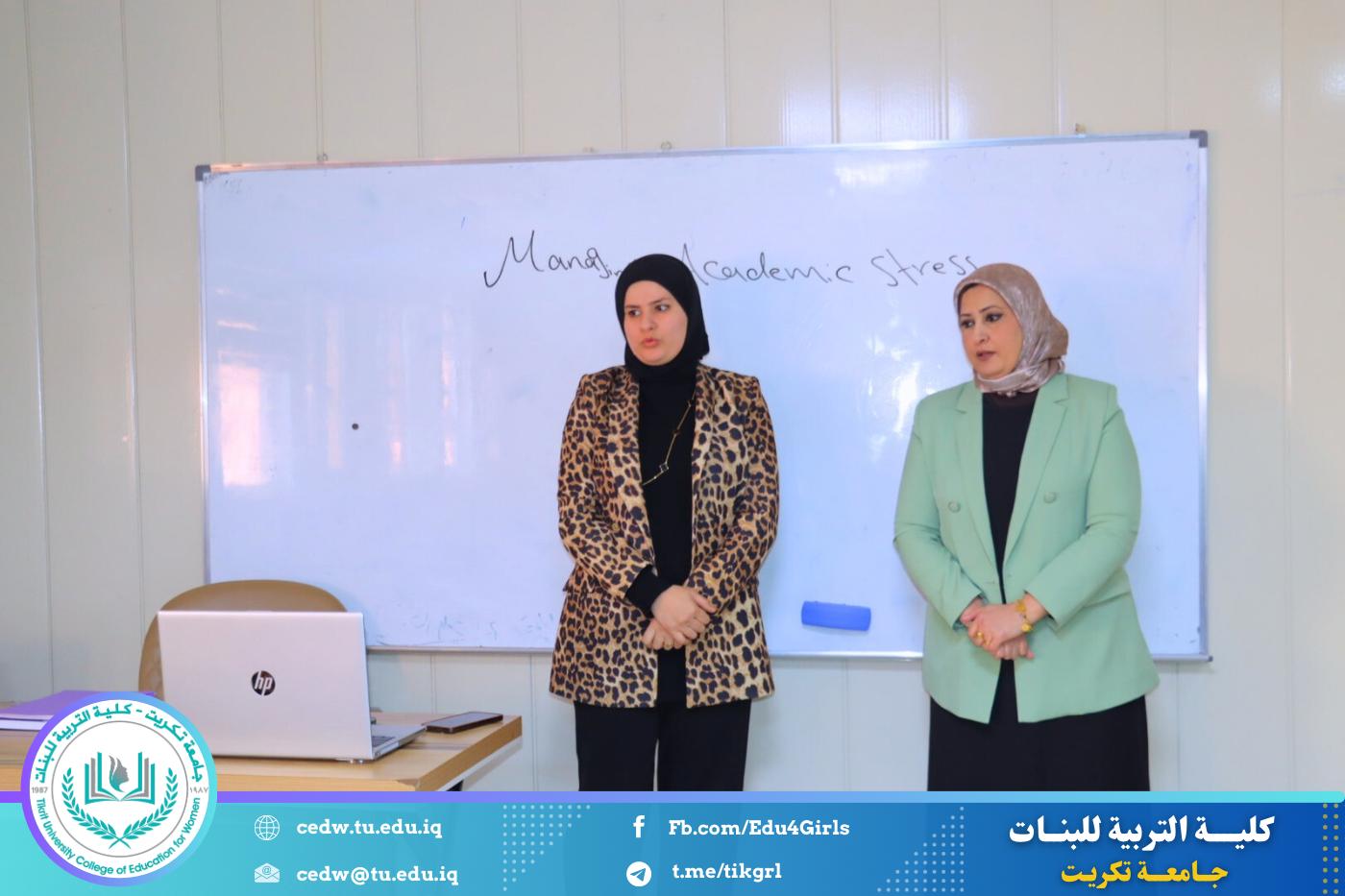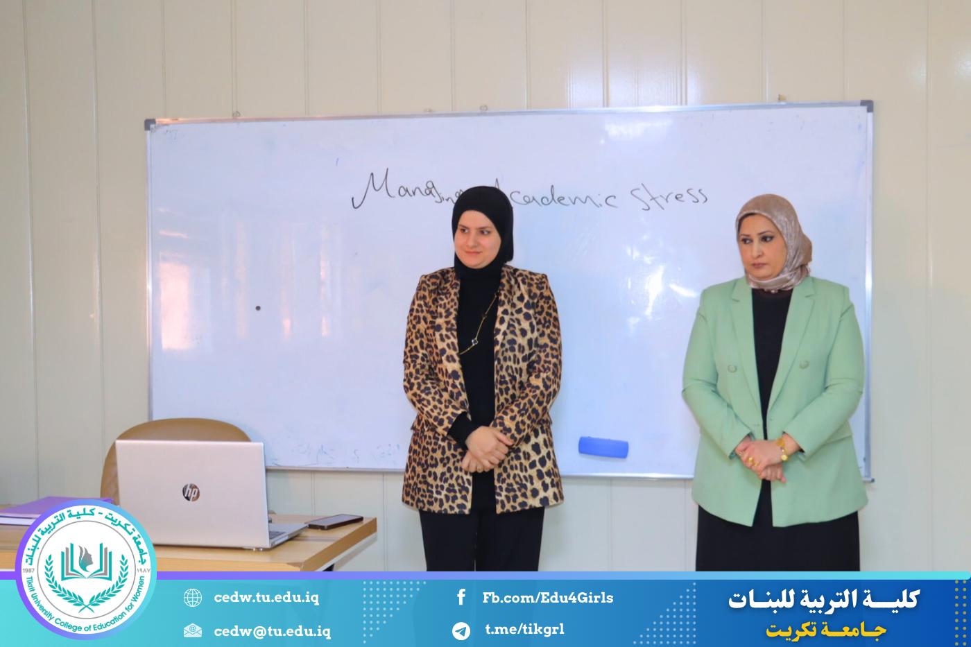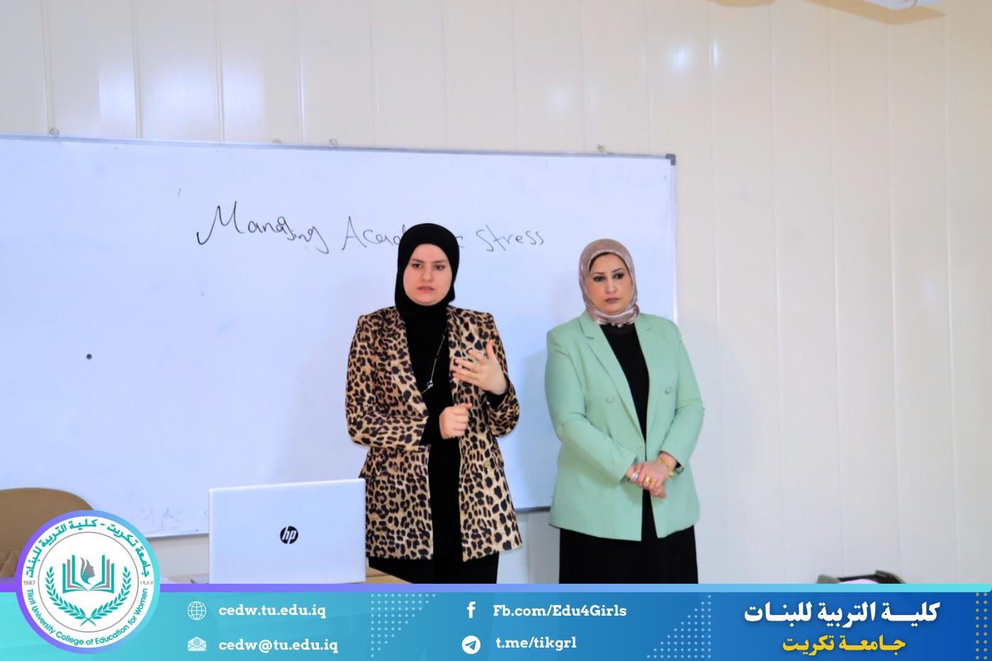 نظّم قسم اللغة الإنكليزية في كلية التربية للبنات – جامعة تكريت، وبالتعاون مع مركز التعليم المستمر في جامعة تكريت، دورةً علميةً بعنوان: «Managing Academic Stress: Strategies for Success»، وذلك على مدى يومي الثلاثاء والأربعاء الموافقين 10–11 / 3 / 2026، وعلى رحاب قاعات قسم اللغة الإنكليزية، بمشاركة عدد من طالبات القسم.