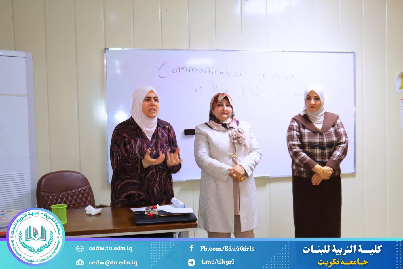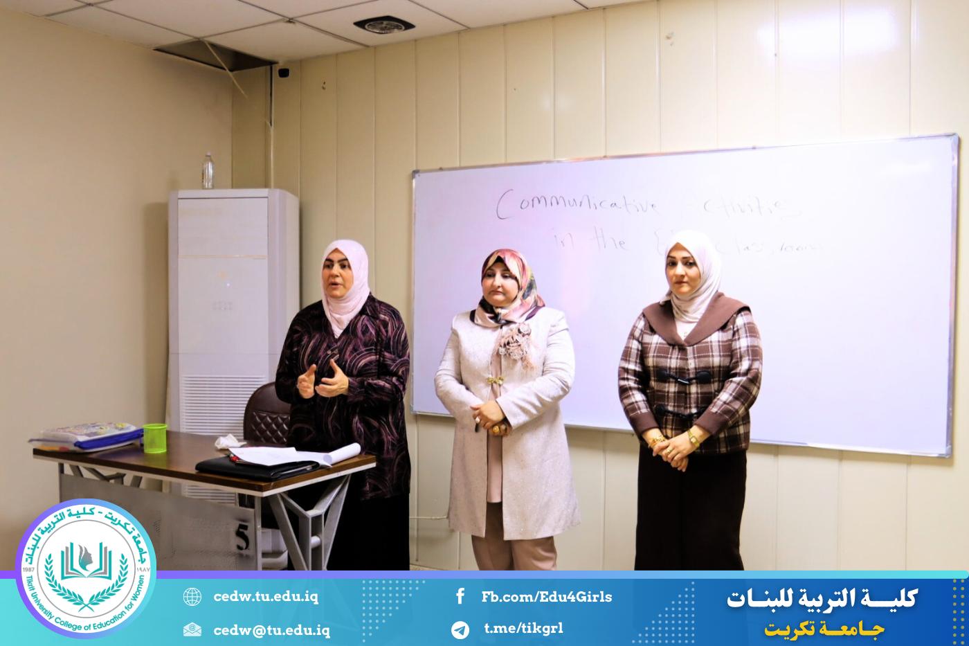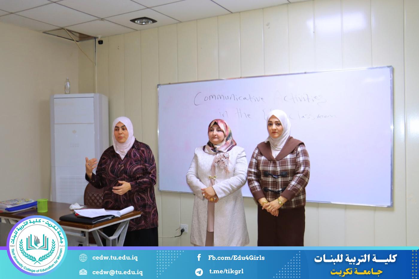 أقامت كلية التربية للبنات – قسم اللغة الإنكليزية، بالتعاون مع مركز التعليم المستمر في جامعة تكريت، دورة تدريبية بعنوان (Communicative Activities in the EFL Classroom)، وذلك يومي الثلاثاء والأربعاء الموافق 10–11 / 3 / 2026، في قاعات قسم اللغة الإنكليزية.
