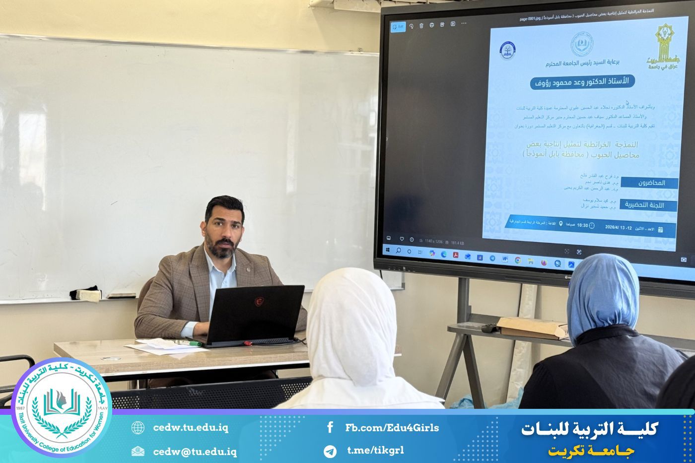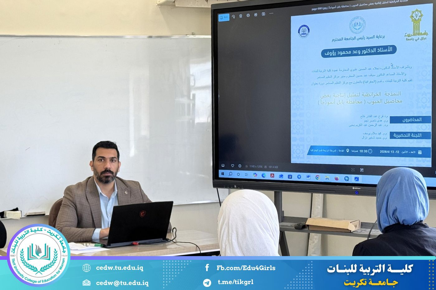 أقامت كلية التربية للبنات – قسم الجغرافية، وبالتعاون مع مركز التعليم المستمر، دورة علمية بعنوان (النمذجة الخرائطية لتمثيل إنتاجية بعض محاصيل الحبوب – محافظة بابل أنموذجًا)، وذلك يومي الأحد والاثنين الموافقين 12–13 / 4 / 2026، على قاعة المرحلة الرابعة في قسم الجغرافية.