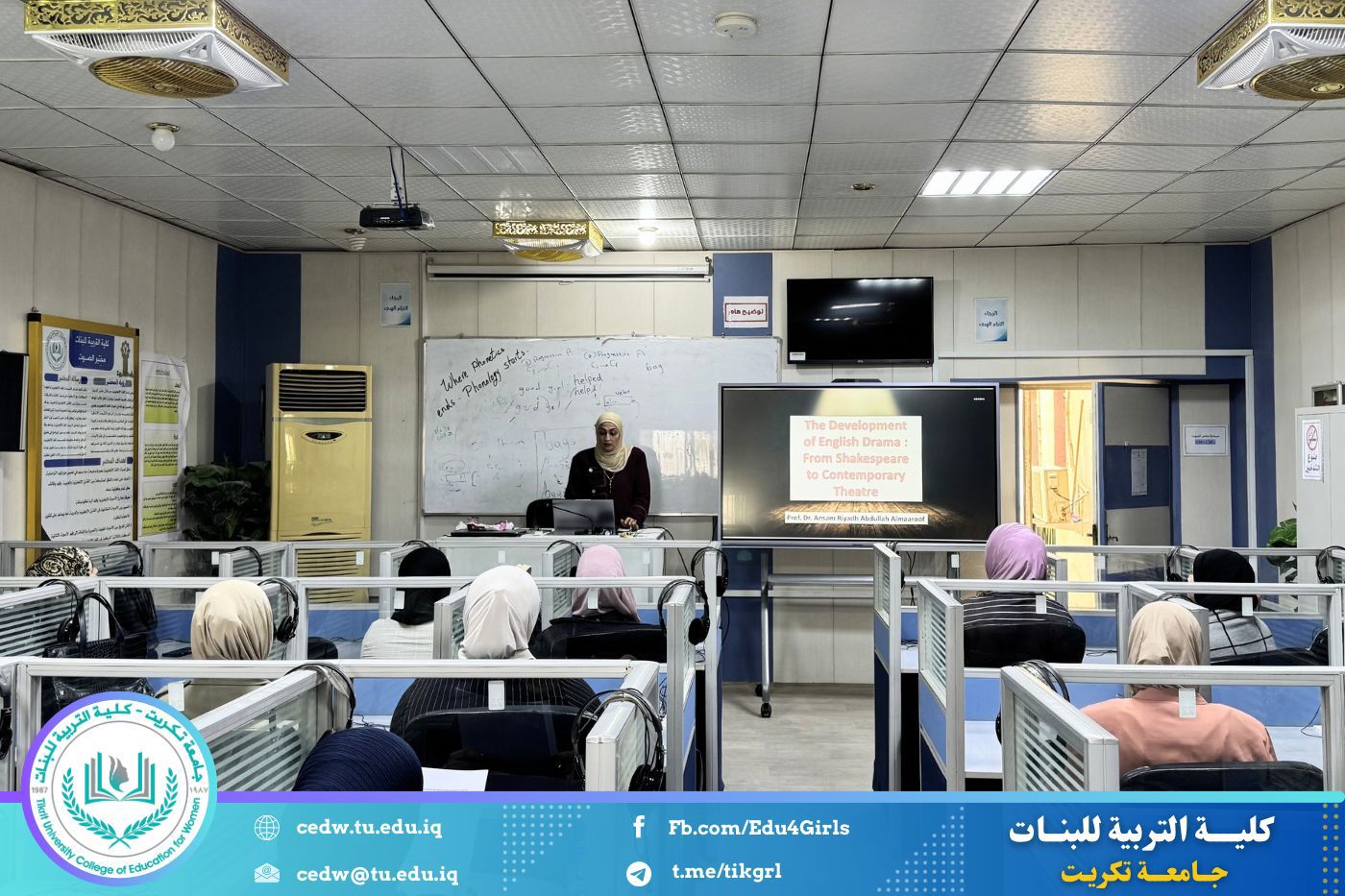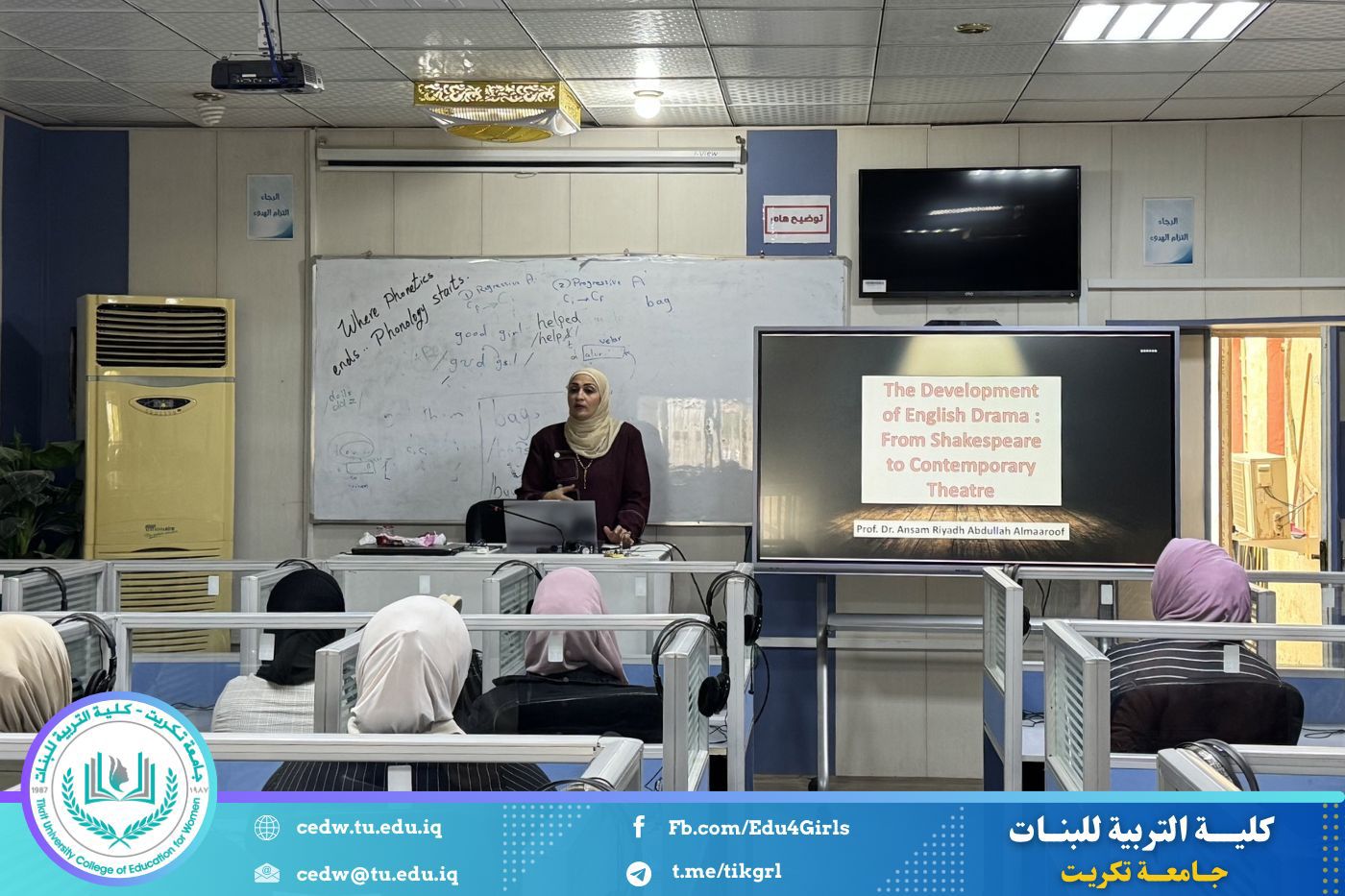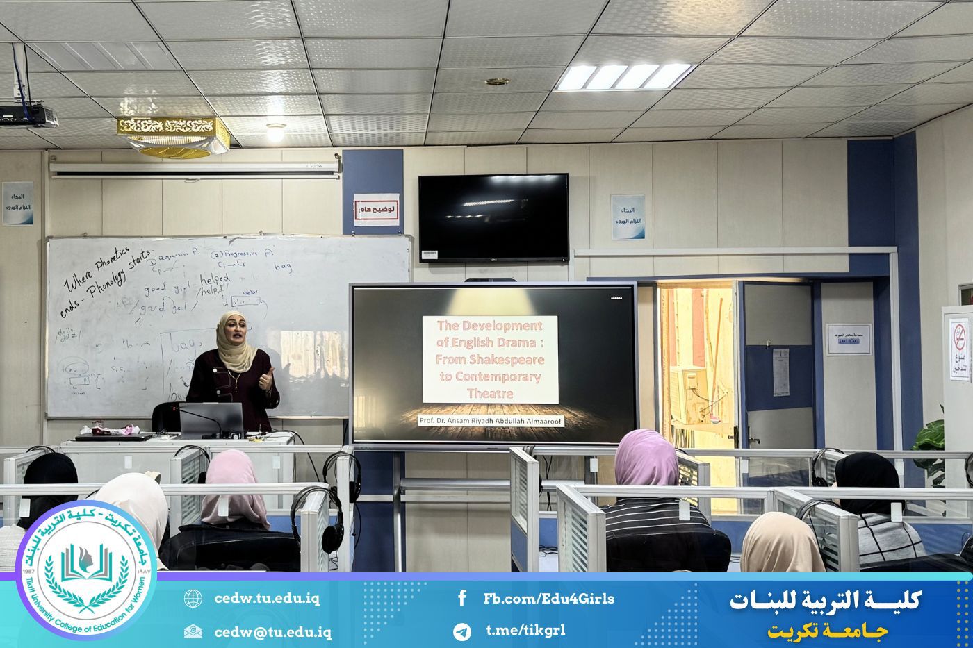 أقامت كلية التربية للبنات – قسم اللغة الإنجليزية، وبالتعاون مع مركز التعليم المستمر، دورة علمية بعنوان (The Development of English Drama: From Shakespeare to Contemporary Theatre)، وذلك على قاعة الماجستير يومي الأحد والاثنين الموافقين 12–13 / 4 / 2026.