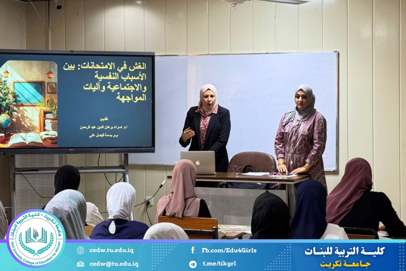 نظّم قسم اللغة الإنكليزية بالتعاون مع وحدة الإرشاد التربوي والتوجيه النفسي في كلية التربية للبنات – جامعة تكريت، ندوة علمية بعنوان: “الغش في الامتحانات: بين الأسباب النفسية والاجتماعية وآليات المواجهة”، وذلك يوم الثلاثاء الموافق 14 / 10 / 2025، في قاعة قسم اللغة الإنكليزية.