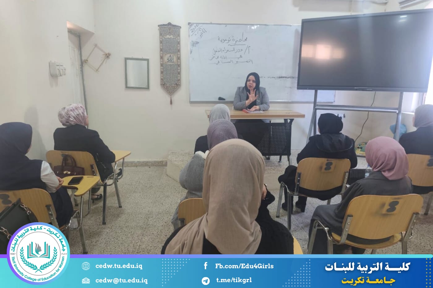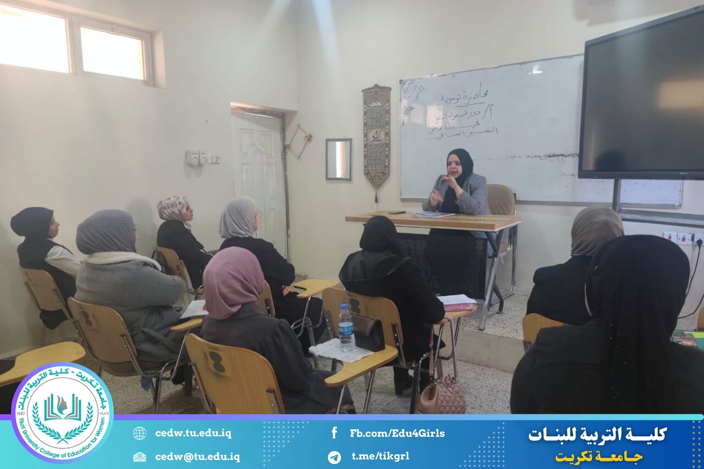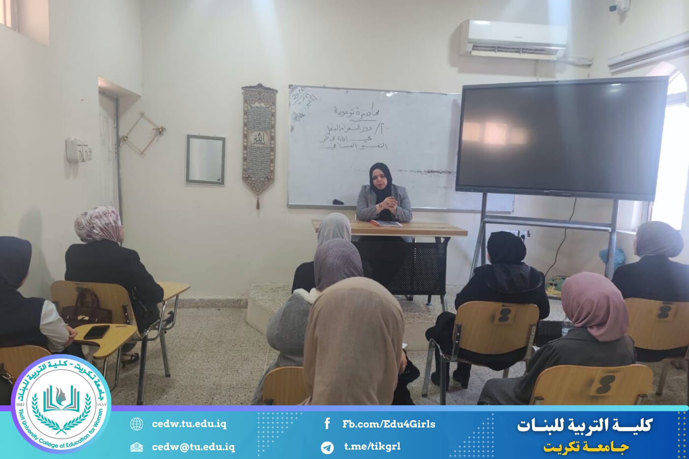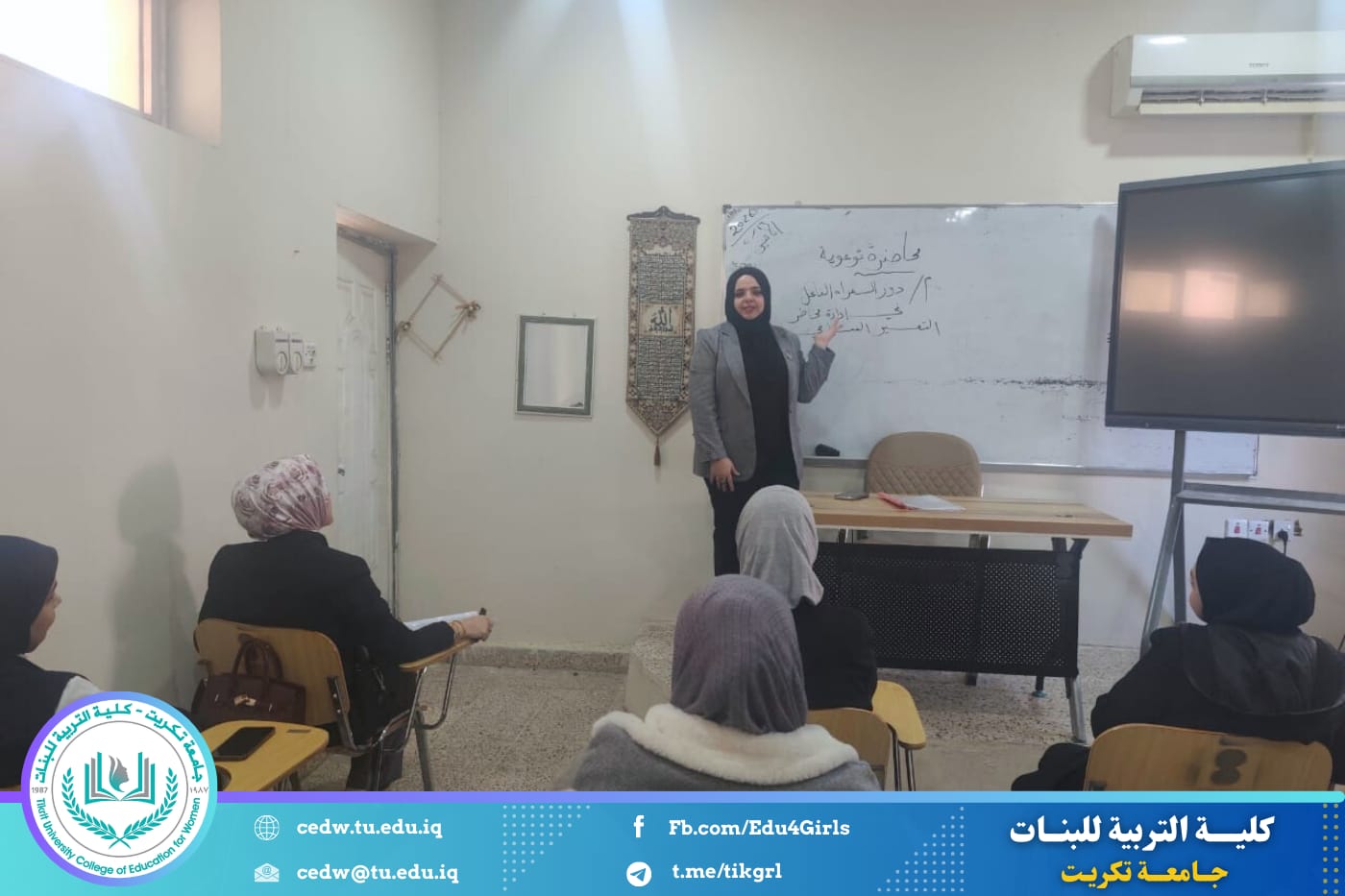 نظّمت وحدة شؤون المرأة بالتعاون مع قسم الاقتصاد المنزلي في كلية التربية للبنات – جامعة تكريت، محاضرة بعنوان: «دور المرأة الفاعل في إدارة مخاطر التغير المناخي»، وذلك صباح يوم الاثنين الموافق ١٦ / ٢ / ٢٠٢٦، على رحاب قاعة قسم الاقتصاد المنزلي.