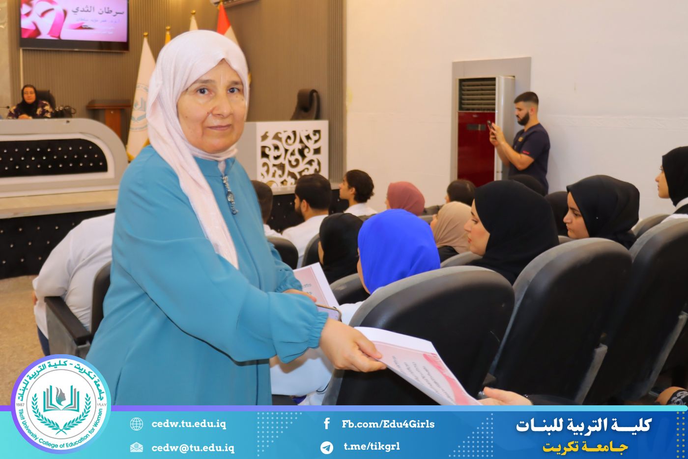 في إطار سعيها المستمر لنشر الوعي الصحي وتعزيز ثقافة الوقاية بين أوساط الطالبات والمنتسبات، نظّمت كلية التربية للبنات في جامعة تكريت، بالتعاون مع شعبة شؤون المرأة ومديرية صحة صلاح الدين وكلية الطب، صباح يوم الأحد الموافق ١٩ تشرين الأول ٢٠٢٥، ندوة توعوية موسّعة حملت عنوان: "الكشف المبكر عن سرطان الثدي"، وذلك على قاعة المرحوم الأستاذ الدكتور جايد زيدان في عمادة الكلية.