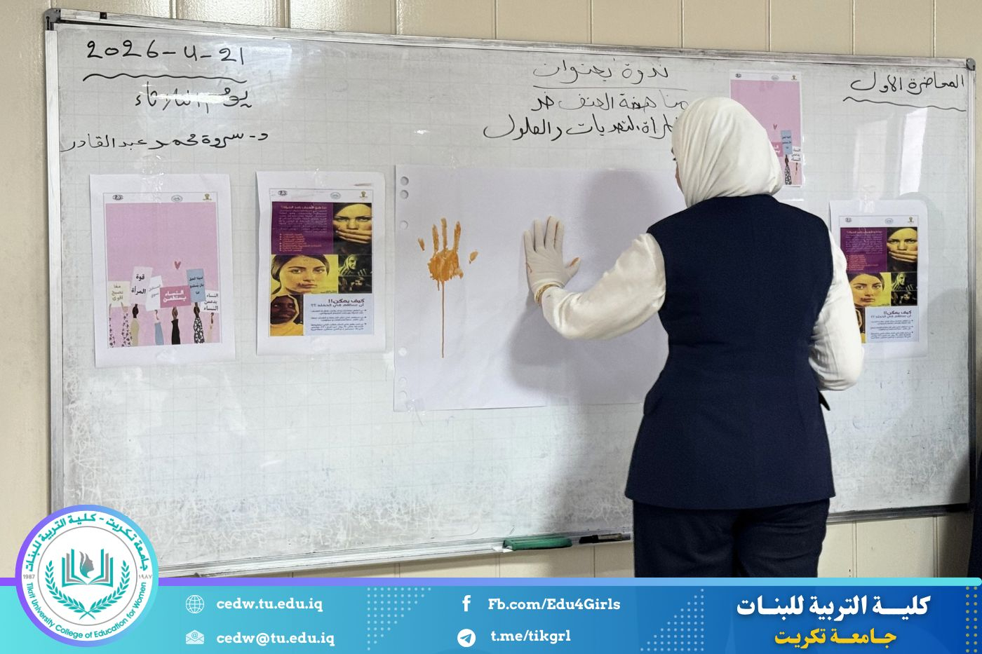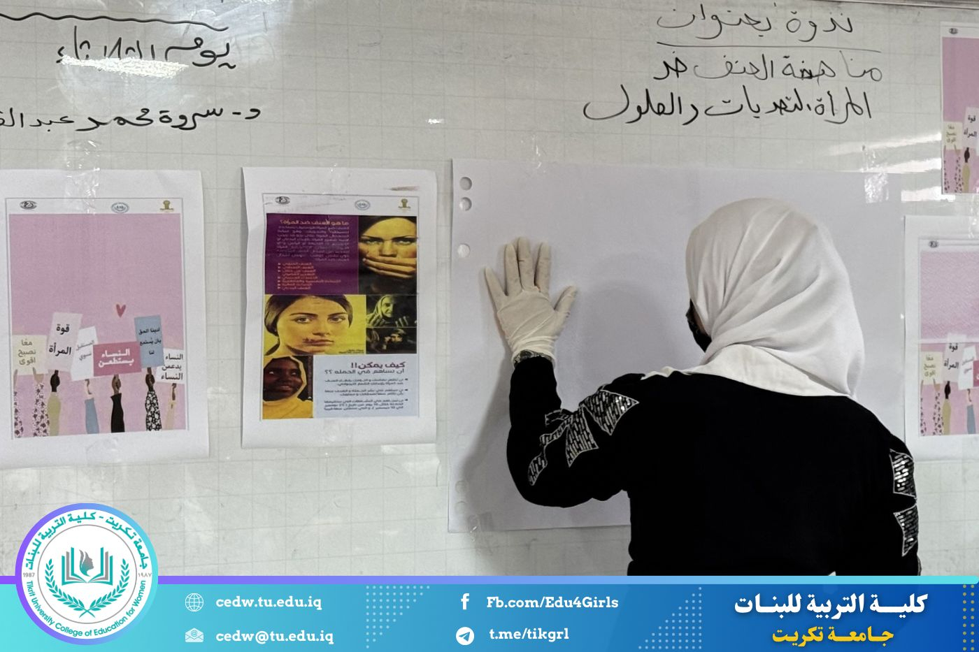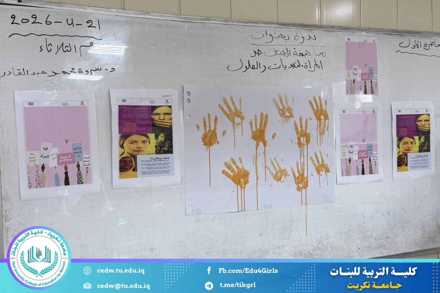 أقامت وحدة شؤون المرأة في كلية التربية للبنات، وبالتعاون مع قسم الرياضيات، ندوة علمية بعنوان (مناهضة العنف ضد المرأة: التحديات والحلول)، وذلك يوم الثلاثاء الموافق 21/ 4/ 2026، على قاعة المرحلة الأولى، بحضور عدد من التدريسيين والطالبات.