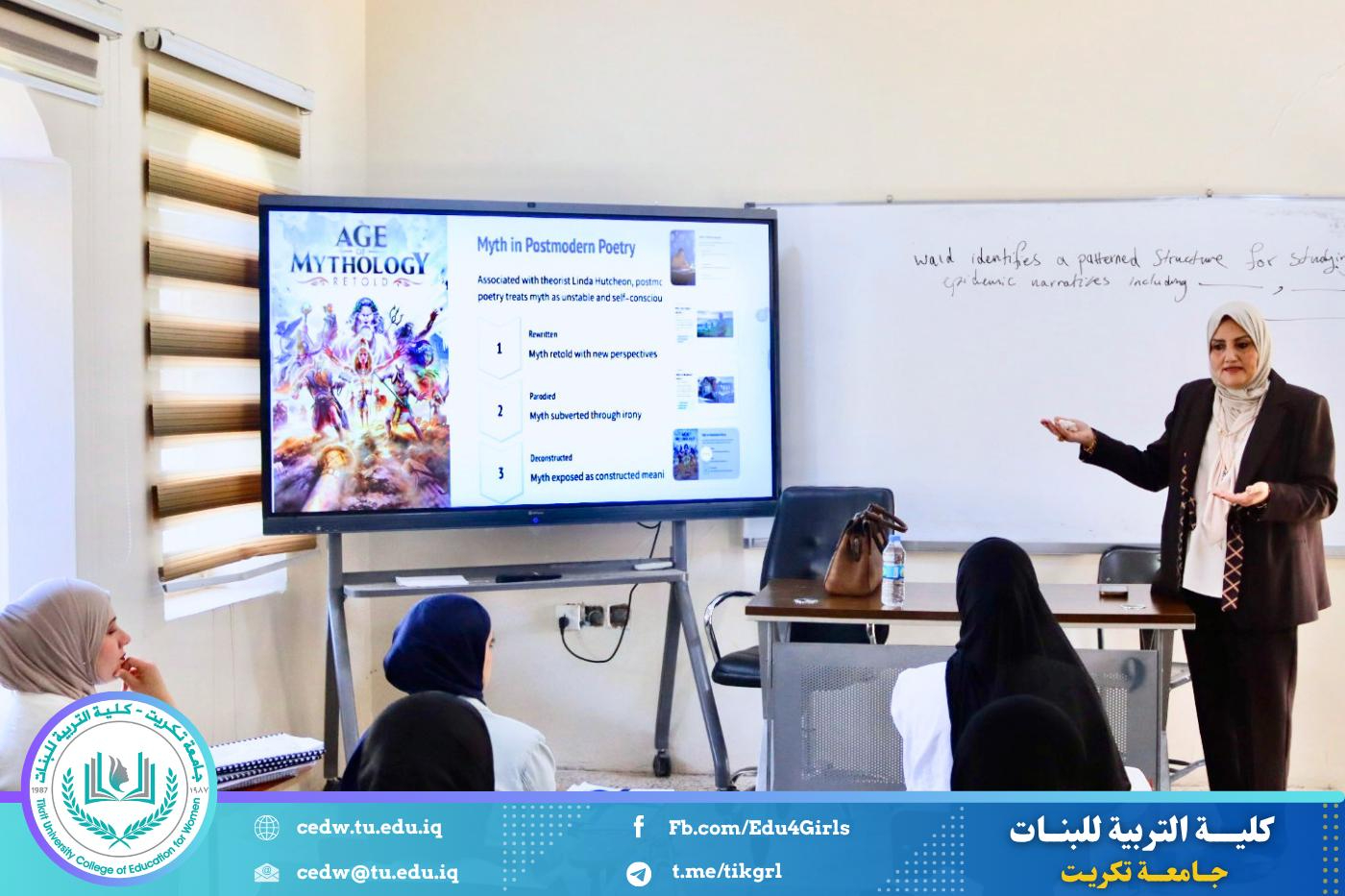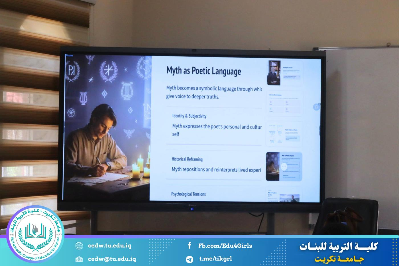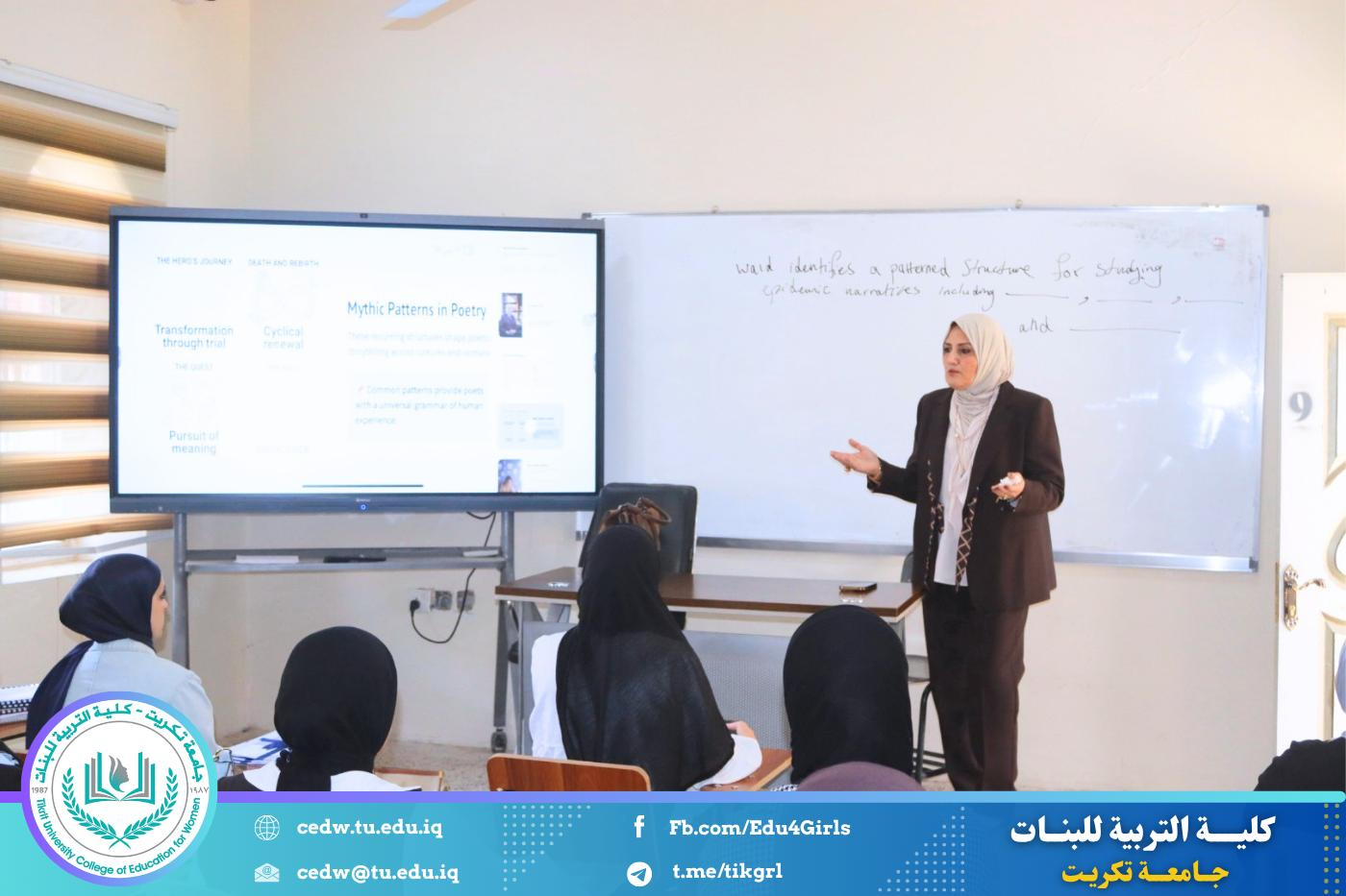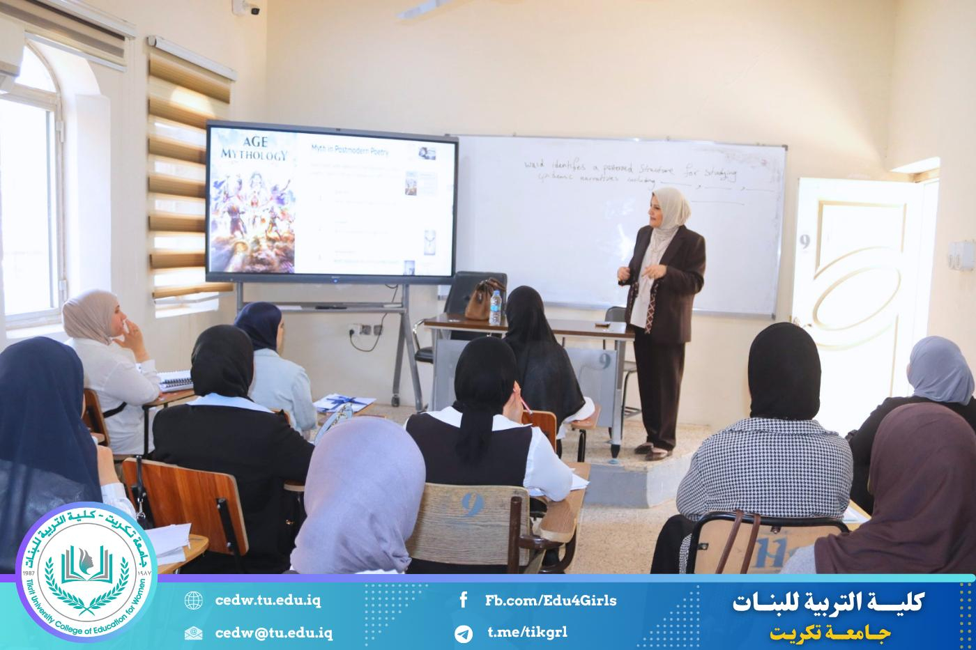 نظّم قسم اللغة الإنكليزية في كلية التربية للبنات – جامعة تكريت، وبالتعاون مع مركز التعليم المستمر في جامعة تكريت، دورةً علميةً بعنوان: “The Role of Myth in Poetry: Exploring Archetypes and Narratives”، وذلك على مدى يومي الثلاثاء والأربعاء الموافقين 21–22 / 4 / 2026، وعلى رحاب قاعة الدكتوراه في قسم اللغة الإنكليزية.