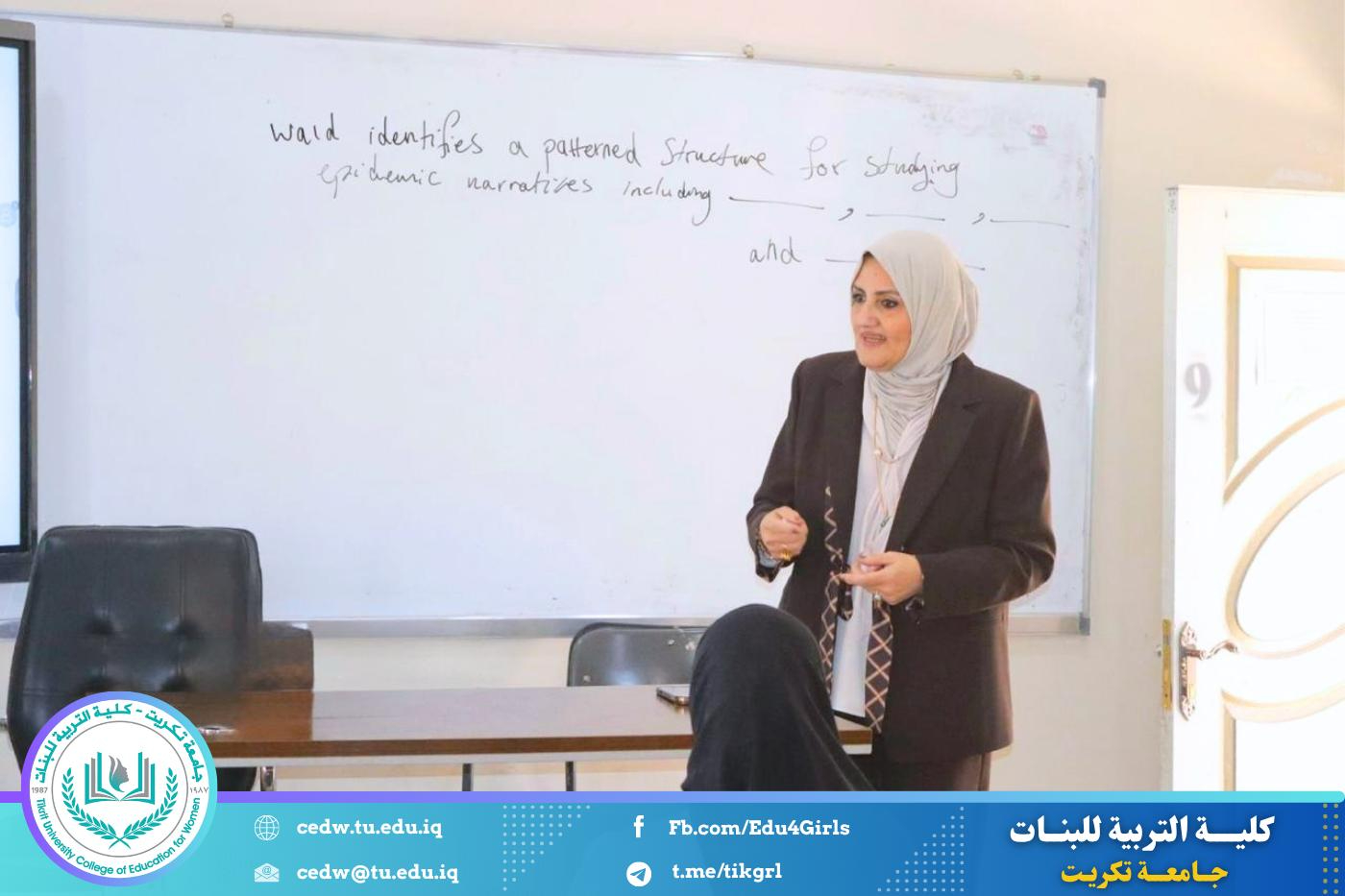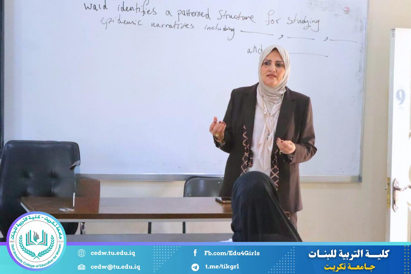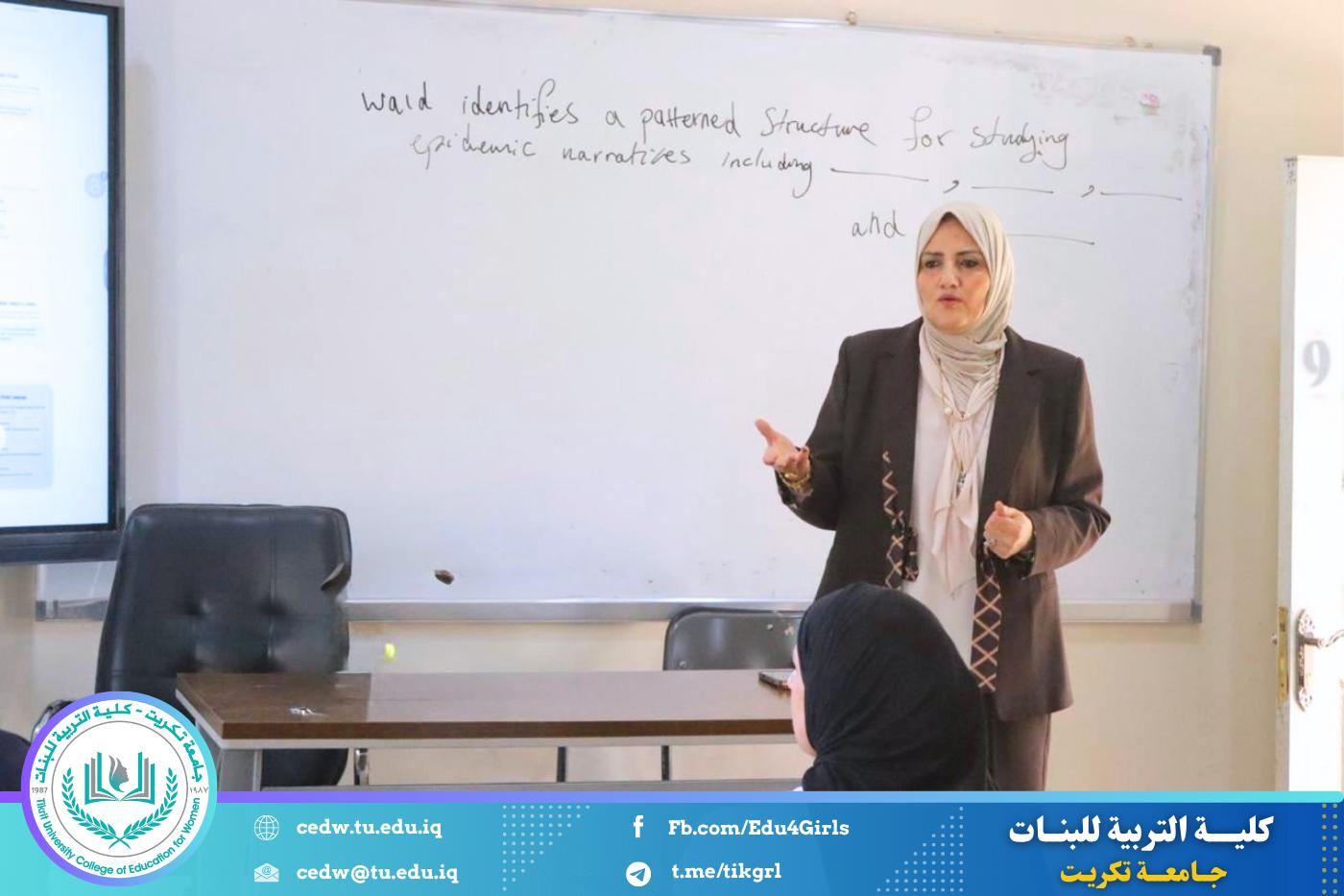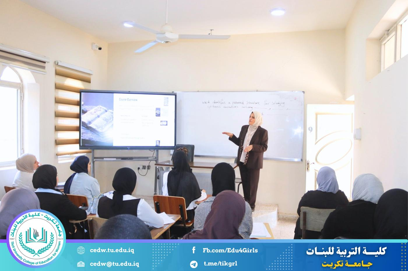 نظّم قسم اللغة الإنكليزية في كلية التربية للبنات – جامعة تكريت، وبالتعاون مع مركز التعليم المستمر في جامعة تكريت، دورةً علميةً بعنوان: “The Role of Myth in Poetry: Exploring Archetypes and Narratives”، وذلك على مدى يومي الثلاثاء والأربعاء الموافقين 21–22 / 4 / 2026، وعلى رحاب قاعة الدكتوراه في قسم اللغة الإنكليزية.