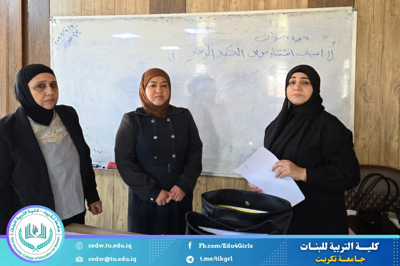 أقام قسم علوم الكيمياء في كلية التربية للبنات، وبالتعاون مع مركز التعليم المستمر، دورة علمية بعنوان (أسباب انتشار مرض الكبد الدهني)، وذلك لمدة ثلاثة أيام (الثلاثاء، الأربعاء، الخميس) الموافق 21–22–23 / 4 / 2026، على قاعة المرحلة الرابعة.