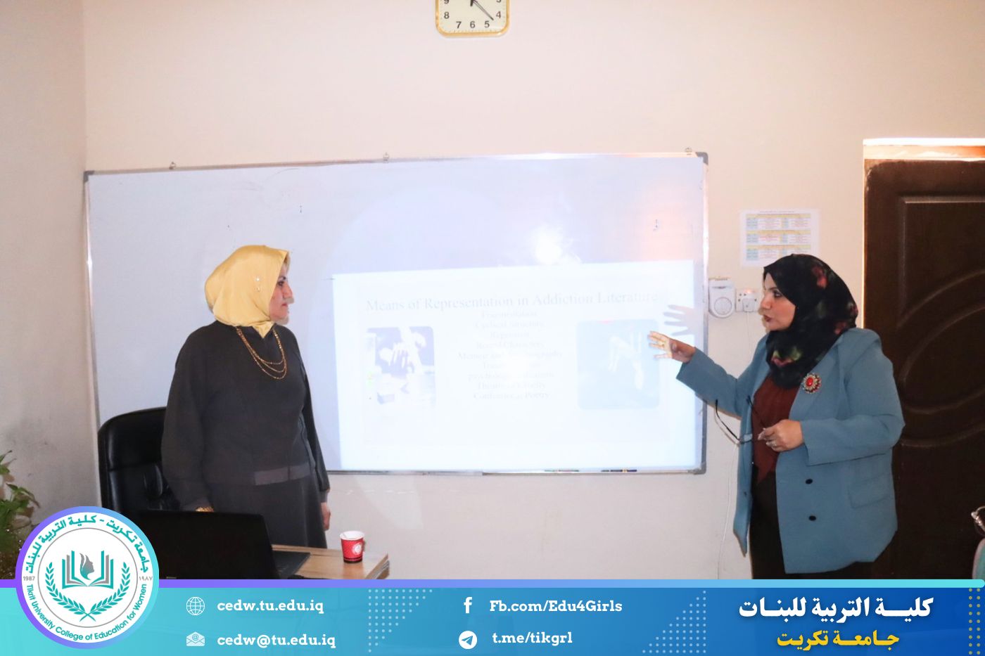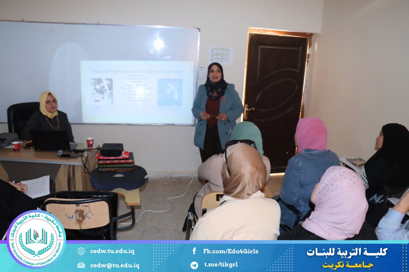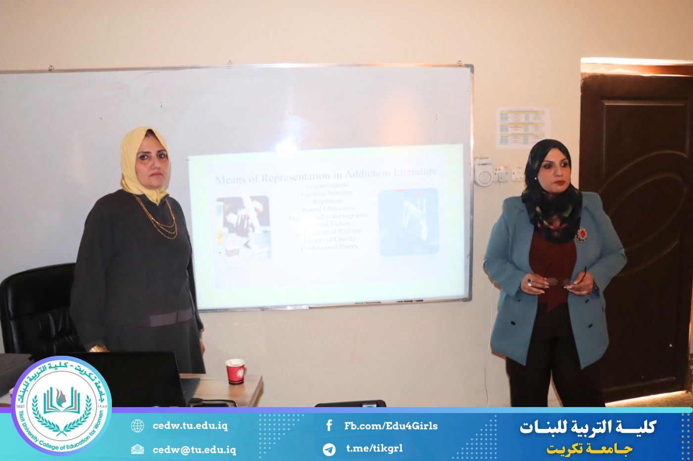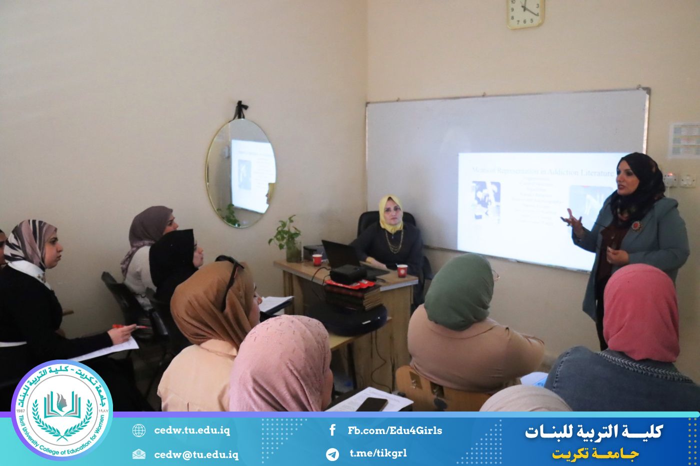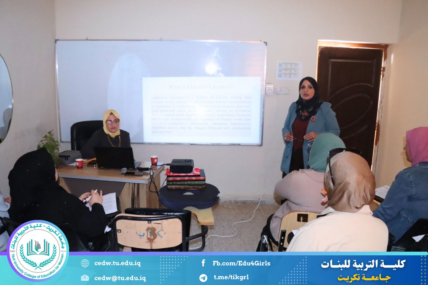 “Addiction Literature: Genres, Key Authors and Texts”، وذلك على مدى يومي الاثنين والثلاثاء الموافقين 6–7 / 4 / 2026، وعلى رحاب القاعة النموذجية في قسم اللغة الإنكليزية، بمشاركة فاعلة من طالبات القسم.