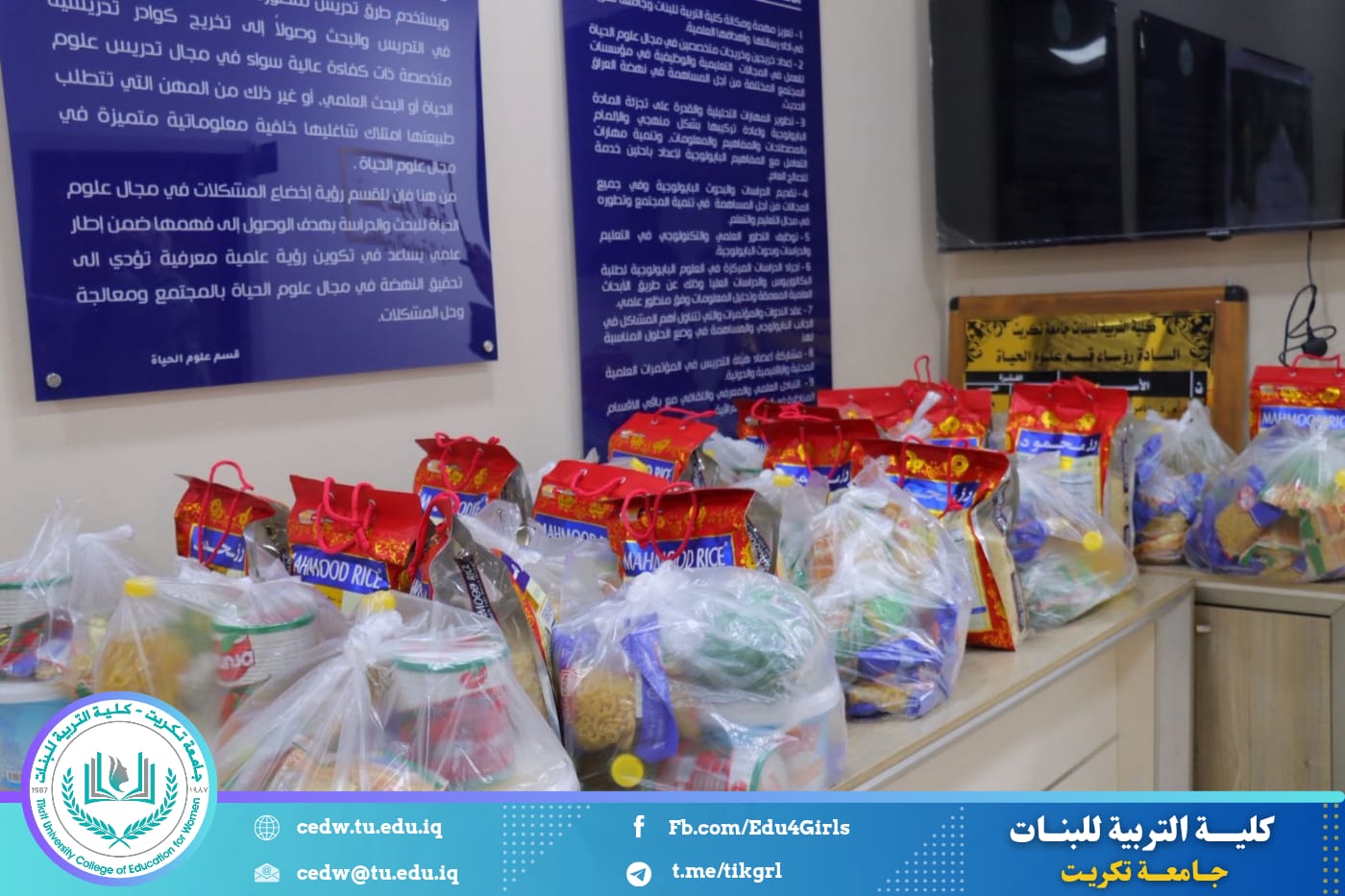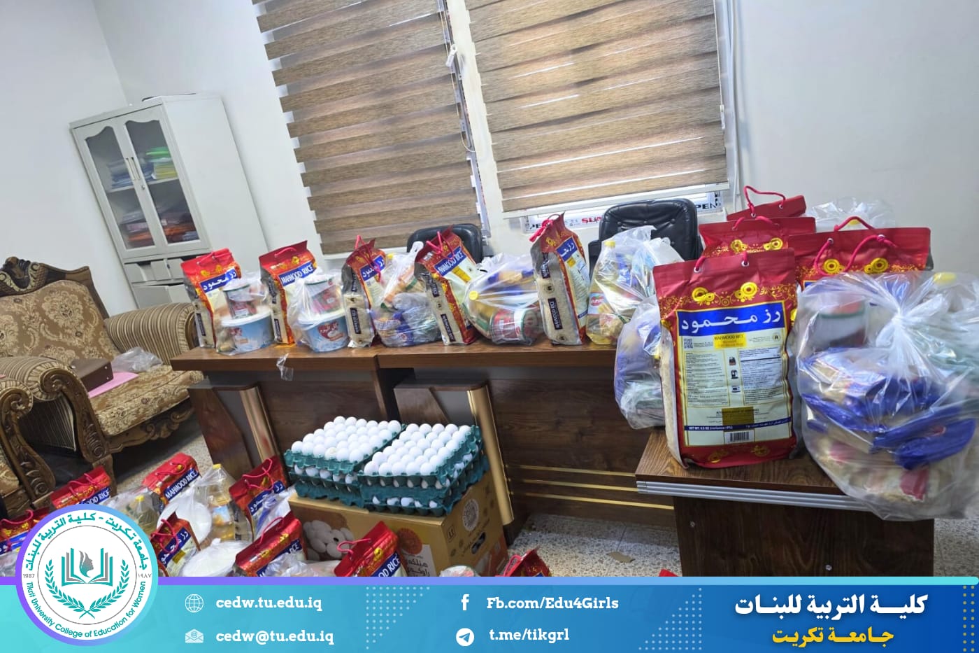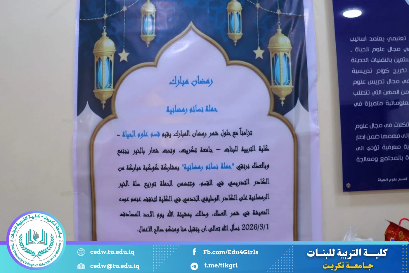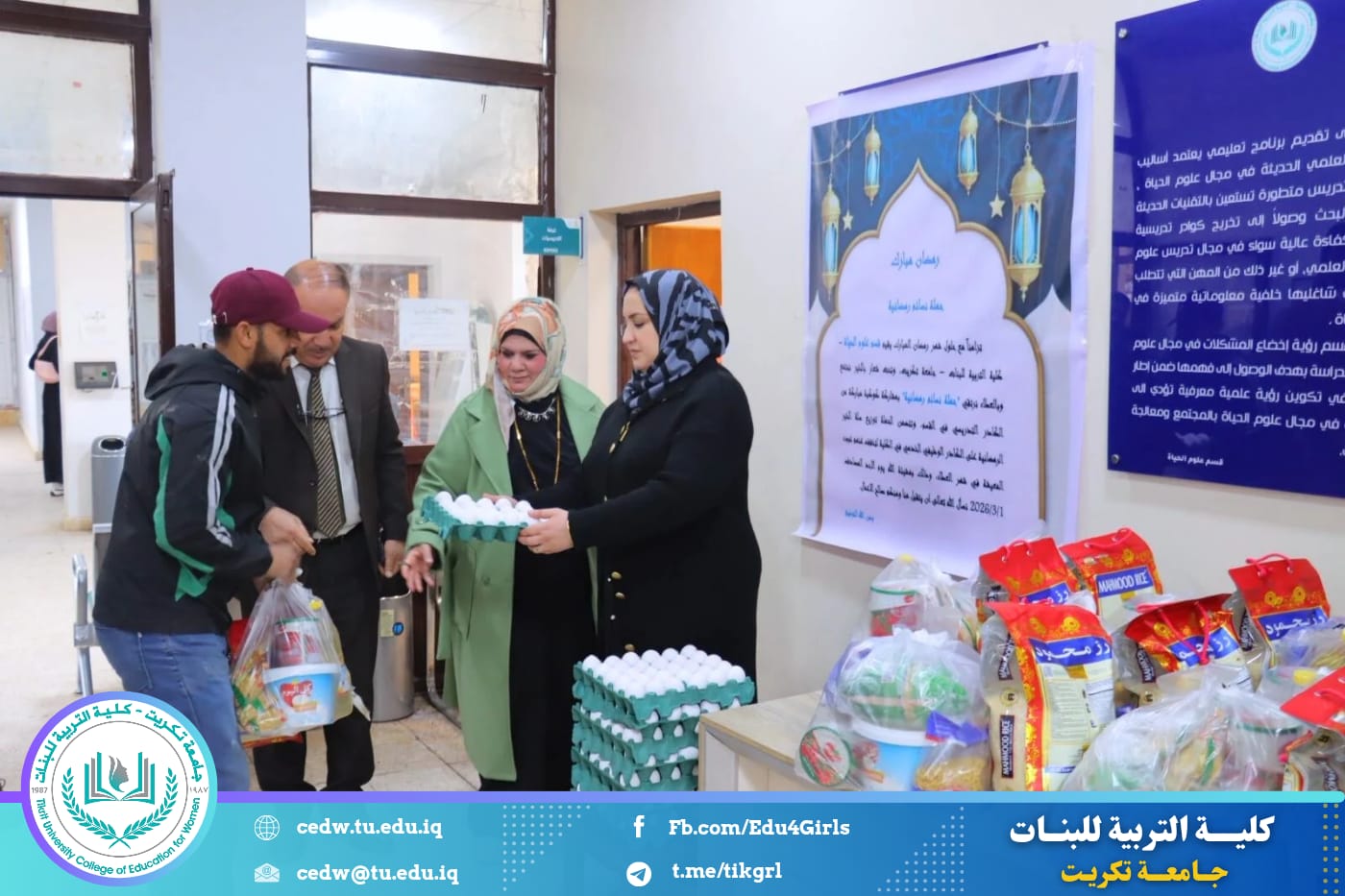 تزامناً مع حلول شهر رمضان المبارك، أقام قسم علوم الحياة في كلية التربية للبنات – جامعة تكريت حملة رمضانية نسوية تحت شعار (بالخير نجتمع وبالعطاء نرتقي)، بمشاركة كوكبة من الكادر التدريسي في القسم، وذلك في إطار تعزيز قيم التكافل الاجتماعي وترسيخ روح التعاون والعطاء خلال هذا الشهر الفضيل.