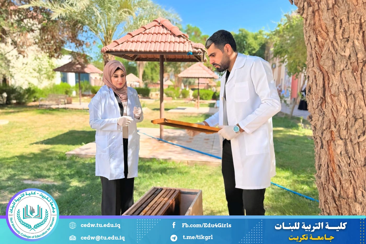 ضمن إطار النشاطات التطبيقية لقسم الاقتصاد المنزلي في كلية التربية للبنات – جامعة تكريت، أجرت المدرس شهد خالد حميد رئيس القسم، اليوم الثلاثاء الموافق ١٤ / ١٠ / ٢٠٢٥، وبالتعاون مع م.د. فلاح سالم داوود أحد تدريسي القسم، متابعة ميدانية لخلايا النحل الخاصة بالدرس العملي لتخصص الغذاء والتغذية.