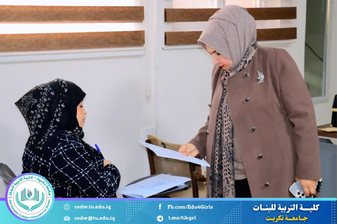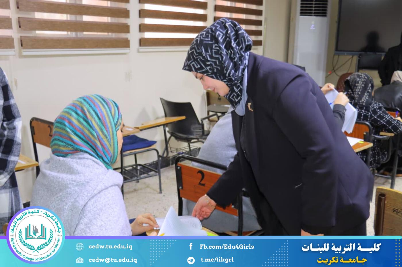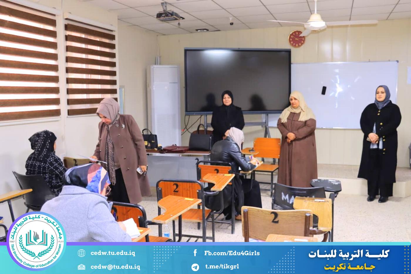 أجرت السيدة عميد كلية التربية للبنات، الأستاذ الدكتورة نجلاء عبدالحسين عليوي، صباح اليوم الثلاثاء الموافق ٢٣ / ١٢ / ٢٠٢٥، جولة تفقدية على القاعات الامتحانية، لمتابعة سير امتحانات الدراسات العليا، برفقتها كل من الأستاذ الدكتورة أشرف جمال محمود معاون العميد للشؤون العلمية، والأستاذ المساعد الدكتورة سلمى خالد ياسين معاون العميد للشؤون الإدارية.