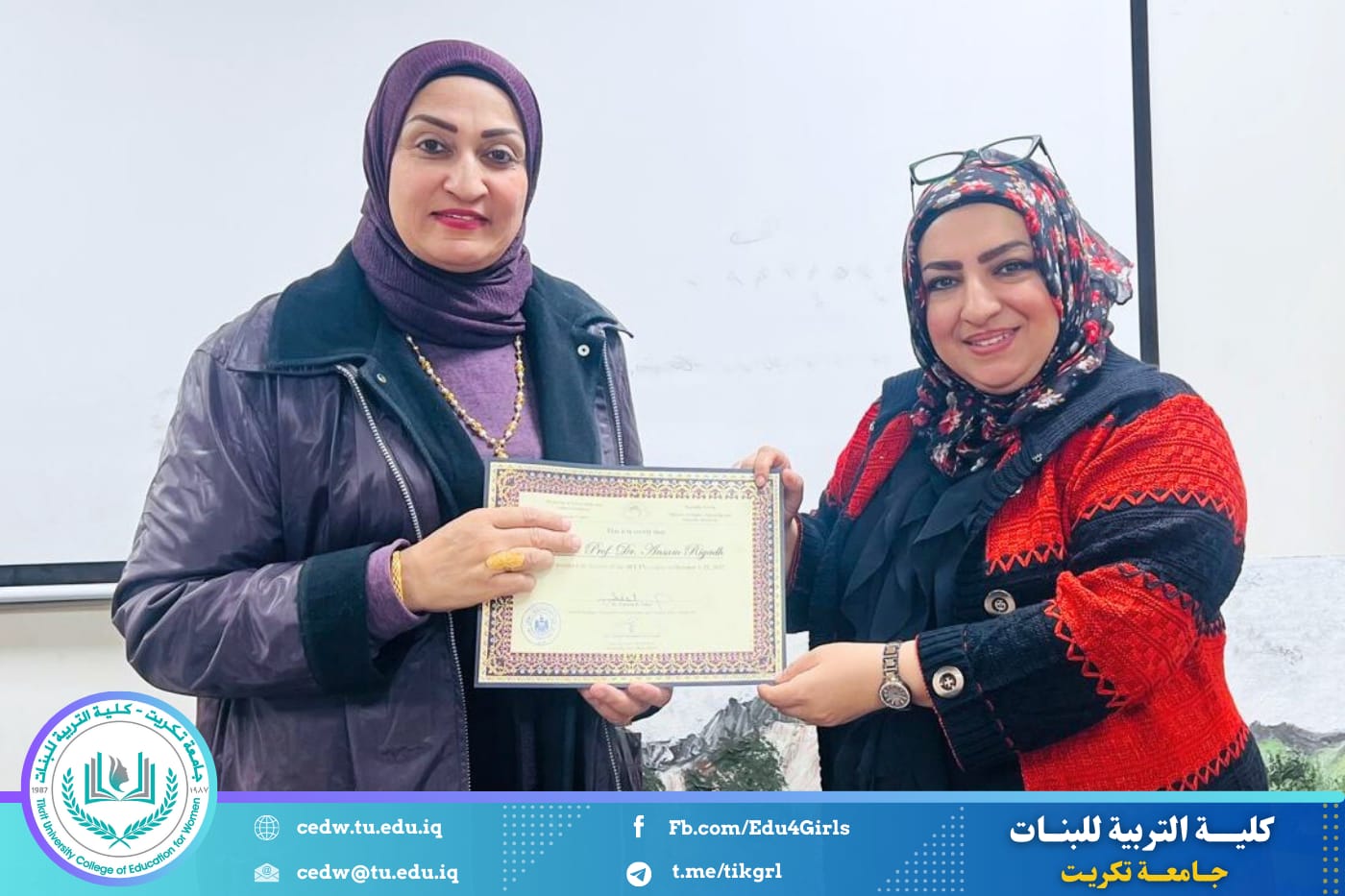 في إطار إسهام كلية التربية للبنات – جامعة تكريت في دعم البرامج الوزارية الهادفة إلى تطوير الكفاءة اللغوية، شاركت الأستاذ الدكتورة أنسام رياض عبدالله المعروف، التدريسية في قسم اللغة الإنكليزية بكلية التربية للبنات، في تقديم محاضرات تخصصية ضمن البرنامج الوزاري التدريبي لإعداد المتدربين لاجتياز امتحان كفاءة اللغة الإنكليزية (IELTS).