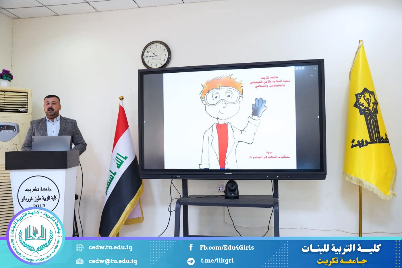 جاءت مشاركة الكلية من خلال المحاضر م.د. مروان ثائر جلال، الذي قدّم محاضرة علمية تناول فيها أسس السلامة المختبرية والإجراءات الوقائية الواجب اتباعها عند التعامل مع المواد الكيميائية والبيولوجية داخل المختبرات الجامعية، بما يضمن بيئة عمل آمنة وخالية من المخاطر.