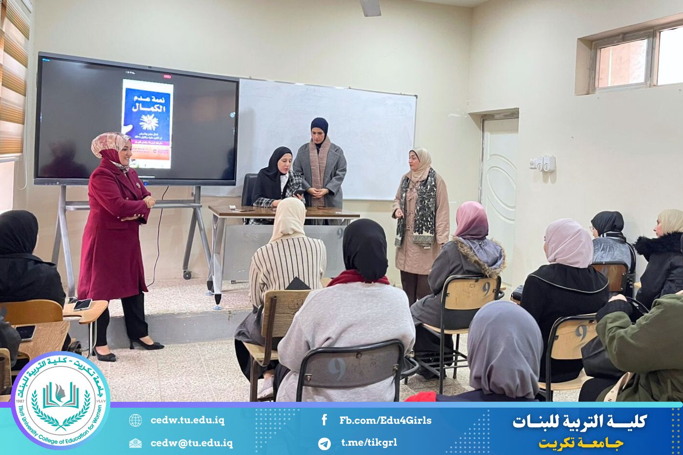 وقد قدّم الجلسة كلٌّ من الأستاذ الدكتورة أنسام رياض عبد الله، والمدرس المساعد بسمة فيصل علي، بمشاركة الطالبتين حنين قاسم دحام وسرى سعدي حسين، حيث تناولت الجلسة محاور الكتاب وأفكاره الرئيسة، مع فتح باب النقاش والتفاعل بين الطالبات.
