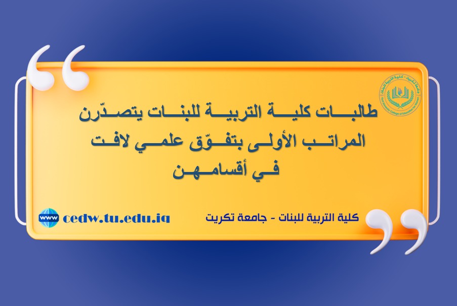 حققت الطالبتان سلوى ثاير دحام وأريج كامل مجيد إنجازًا أكاديميًا متميزًا بتصدّرهما المراتب الأولى في أقسامهما بكلية التربية للبنات – الدراسة الصباحية، خلال العامين الدراسيين ٢٠٢٣ / ٢٠٢٤ و٢٠٢٤ / ٢٠٢٥، في صورة مشرّفة تعكس مستوى الجدّ والاجتهاد الذي تتميز به طالبات الكلية.
